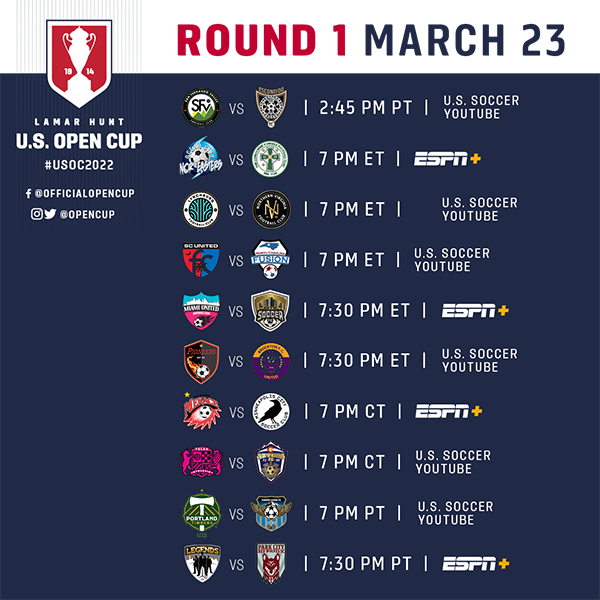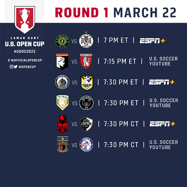 Twenty-three Division II and 23 Division III pro teams will see their first Open Cup action in the Second Round, which is scheduled for April 5-7. The 16 amateur winners from the First Round will join the pro clubs in a stage that will feature a modern era-record 31 matches in a single round. All 31 games will be broadcast live on ESPN+.